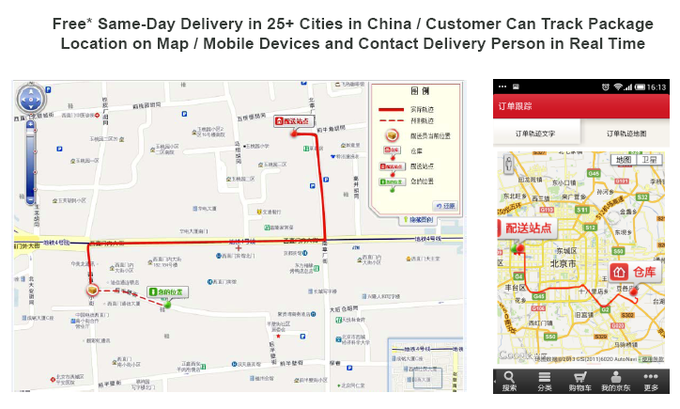 京东商城在25+城市推行当日送达,客户可通过地图、手机查看包裹位置并实时联络快递员