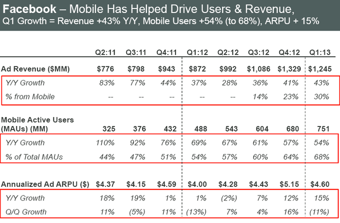 报告以Facebook为例,说明移动对用户和收入的驱动作用越来越大,对广告ARPU值的贡献越来越高: