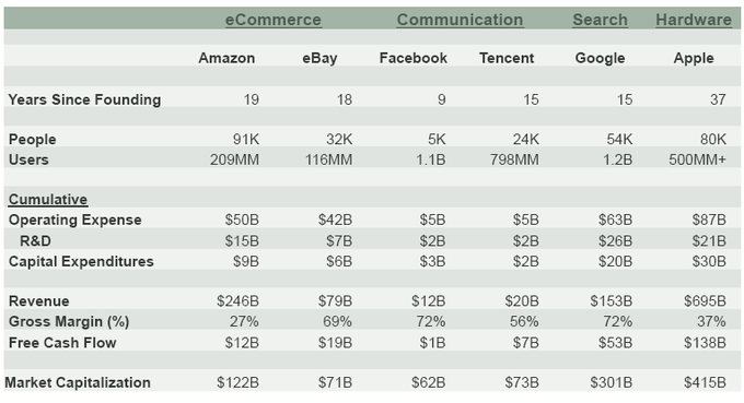 PPT还对比了几家最大的互联网上市公司的表现。同类的腾讯与Facebook对比而言,大家在运营支出、研发投入上持平,腾讯在收入、市值等方面要超过Facebook,但是Facebook的用户更多,雇员更少,利润率更高。