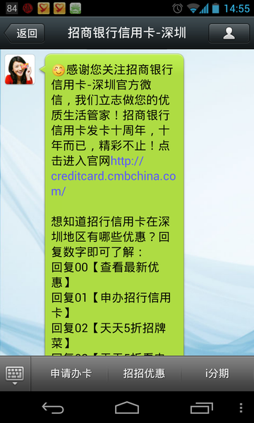 然后,微信公众号的自动回复功能把中国各运营商遗忘的 USSD 业务发扬到了极致。USSD 全文是 Unstructured Supplementary Service Data ,即非结构化补充数据业务,用户输入一些网络已预先设置好的字符串,发送给网络,网络会根据指令选择用户需要的服务。我一直很奇怪,为什么中国运营商不支持 USSD ,话费查询、账单查询的自助服务完全可以通过 USSD 实现。或许中国运营商不想让完全免费的 USSD 影响短信、话音业务的发展吧。顺便说一句,肯尼亚运营商 Safaricom 就利用 USSD 运营了全世界最成功的移动支付服务 M-Pesa 。看看下面两张图,上图是电信业的 USSD 业务示意图,下图是微信中公众号的菜单截图,完全是同样的业务逻辑。微信最近在测试自定义菜单,只是把呈现方式做了调整和优化,万变不离其宗。