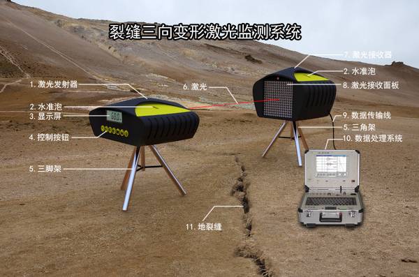 地裂缝等的地质灾害三向变形,公路桥梁以及水利水电工程的各种裂缝变形具有一定的多维变形特征,因此,针对裂缝的三向变形监测系统的研究对于地质灾害变形监测与预警,以及土木工程不均匀变形等不良工程问题安全评估具有重大意义。裂缝三向变形激光监测系统基于三向变形测量的原理与方法,应用激光技术,无线传输技术等实现了裂缝在同一监测点的三个方向位移的同步监测、数据的同步输出,以及分级预警,具有很大的工程实用价值。