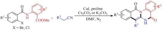 二、设计了含异喹啉酮、喹喔啉酮结构的新型含氮杂环分子,建立了铜催化的以邻氨基苯甲酸酯为基础的一锅反应制备异喹啉酮喹唑啉酮的新方法。该方法以N-(2’-甲氧羰基芳香基)-2-卤代芳香甲酰胺与取代乙腈为原料,使用CuI为催化剂,K2CO3 或Cs2CO3为碱,DMF为溶剂,部分底物在脯氨酸配体的参与下,高产率地得到了一系列具有异喹啉酮、喹唑啉酮结构的含氮杂环化合物,产物具有很高的结构多样性。