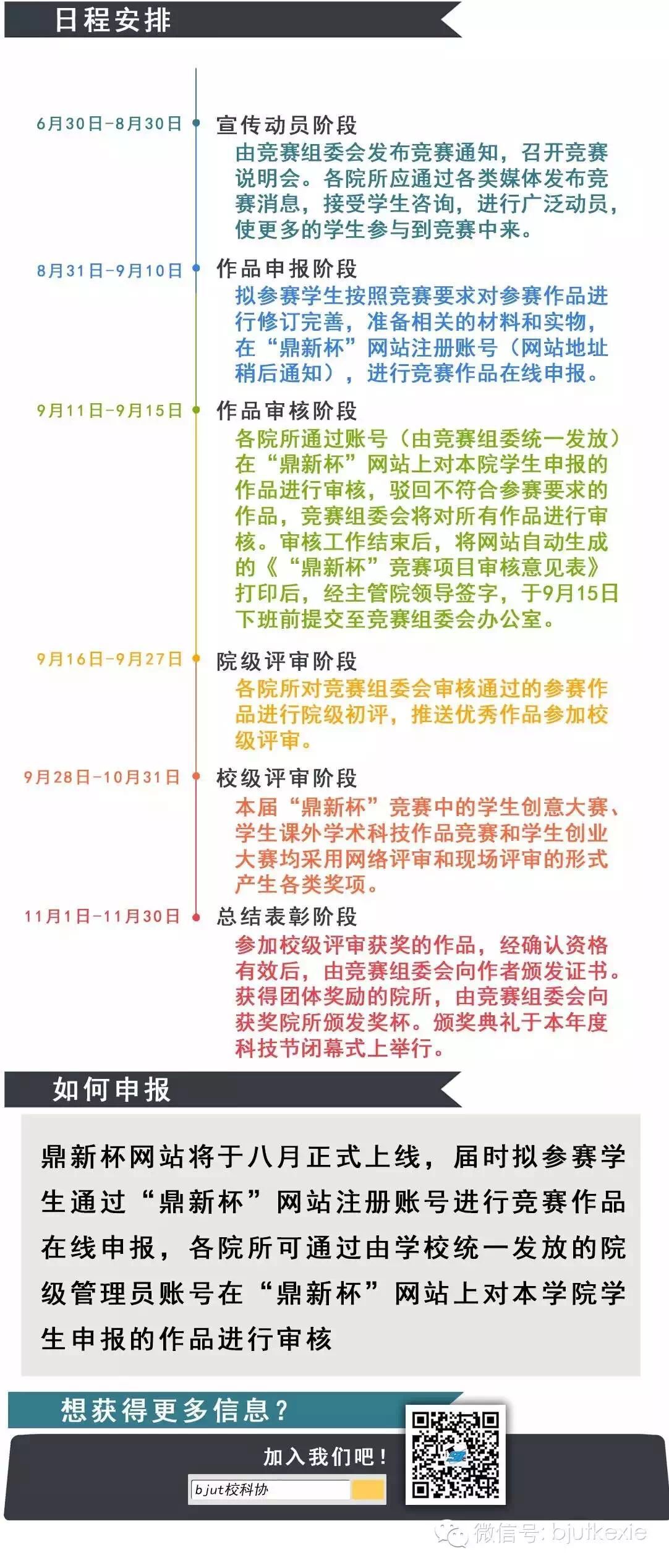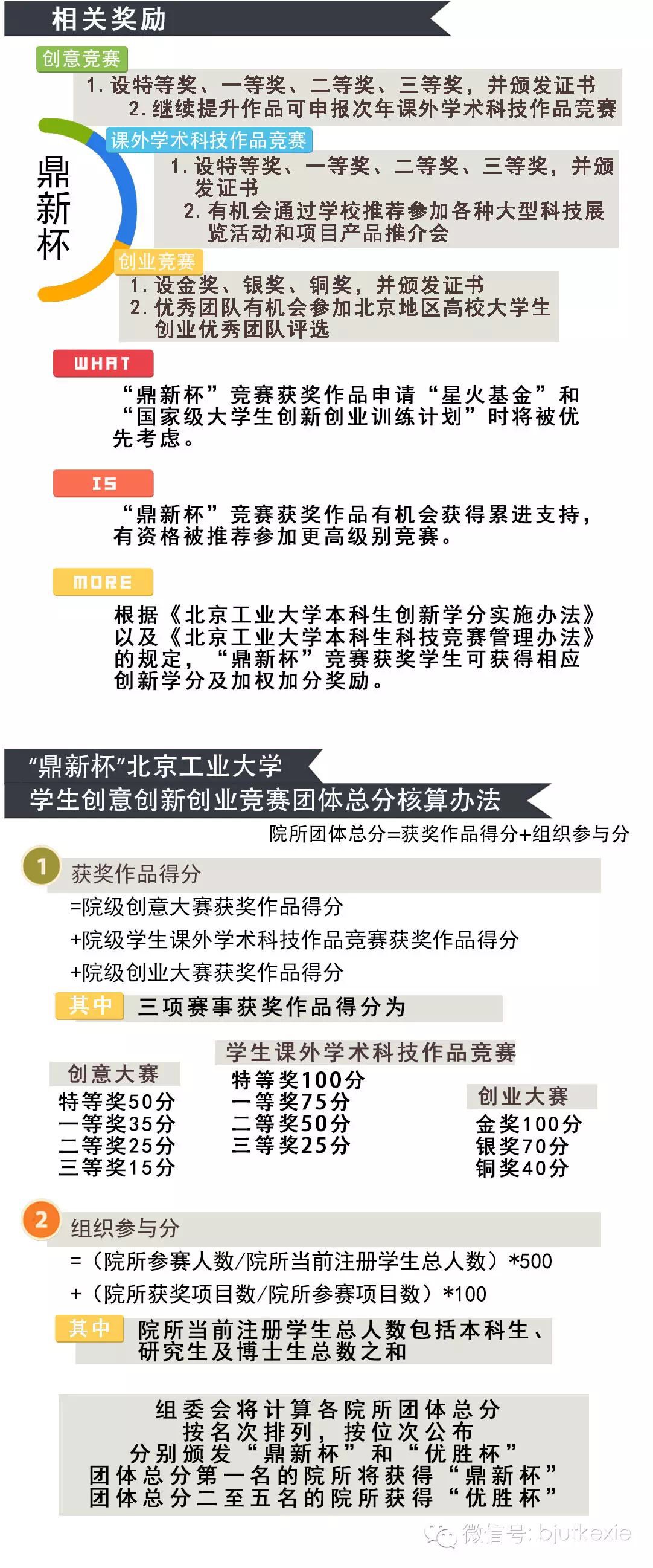 北京工业大学“鼎新杯”学生创意创新创业竞赛是为培养我校学生的科学精神和科学态度,激发我校学生的创新创业热情,营造有利于学生健康成长和创新创业的良好氛围而举办的竞赛。“鼎新杯”竞赛采用“一杯三赛”制度,即同时举办学生创意大赛、学生课外学术科技作品竞赛和学生创业大赛三项主体赛事,努力实现创意、创新、创业“三创”体系的融合。竞赛以“培养创新意识、启迪创意思维、提升创造能力、造就创业人才”为宗旨,努力培养和提高广大学生的创新精神、创业意识和创新创业能力,培养和造就“大众创业、万众创新”的生力军。坚持将学生创新创业活动与学校教学工作、科研工作、学生思想政治教育工作紧密结合,促进我校学生课外科技创新活动和创业工作的蓬勃开展,帮助更多学生通过创新创业的实际行动为实现“中国梦”贡献力量。本竞赛由北京工业大学团委、就业创业指导中心、教务处、研究生院、科学技术发展院共同主办,由校团委承办。